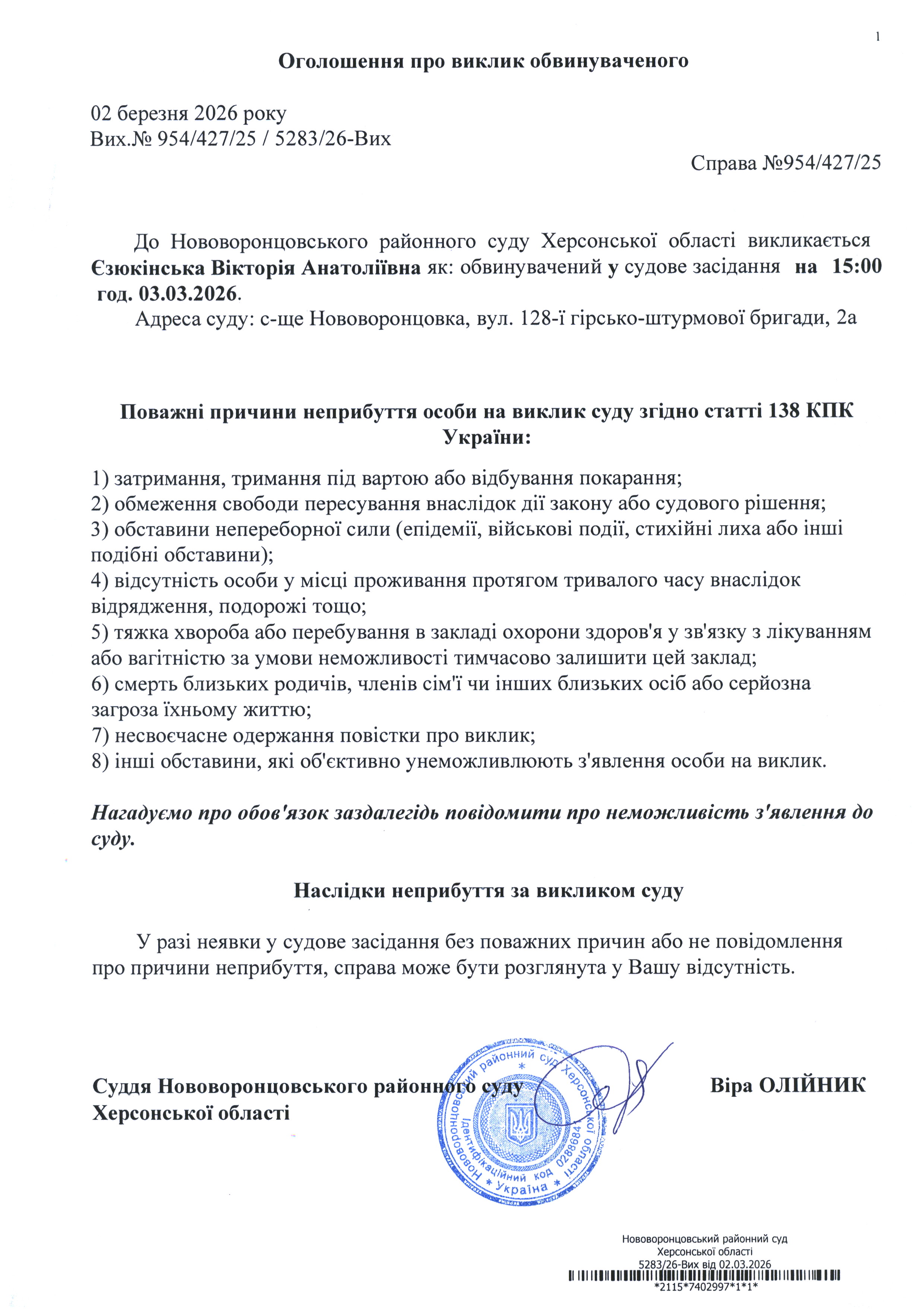 До суду викликається Єзюкінська Вікторія Анатоліївна на 15 год. 00 хв. 3 березня 2026 року