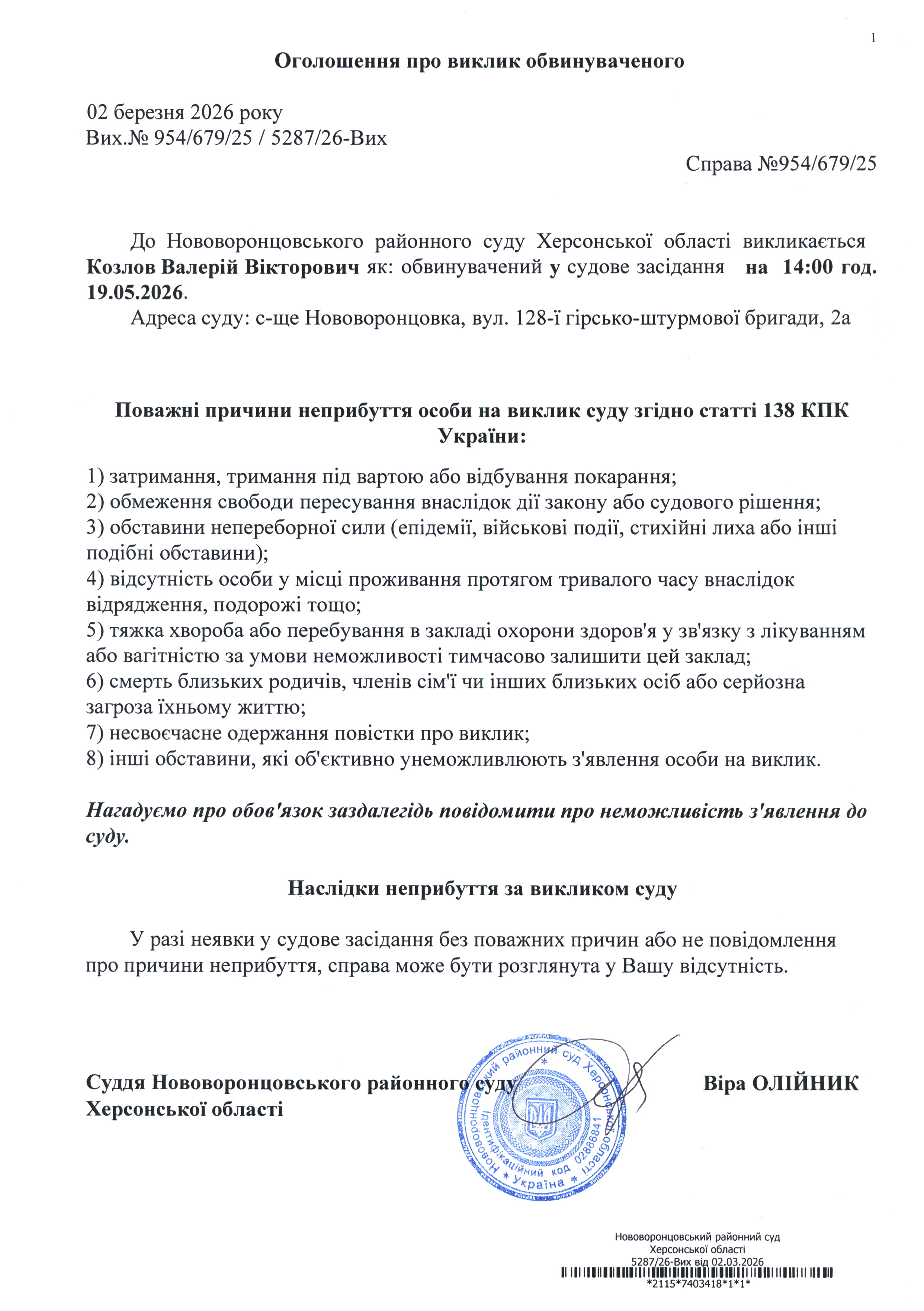 До суду викликається Козлов Валерій Вікторович на 14 год. 00 хв. 19 травня 2026 року