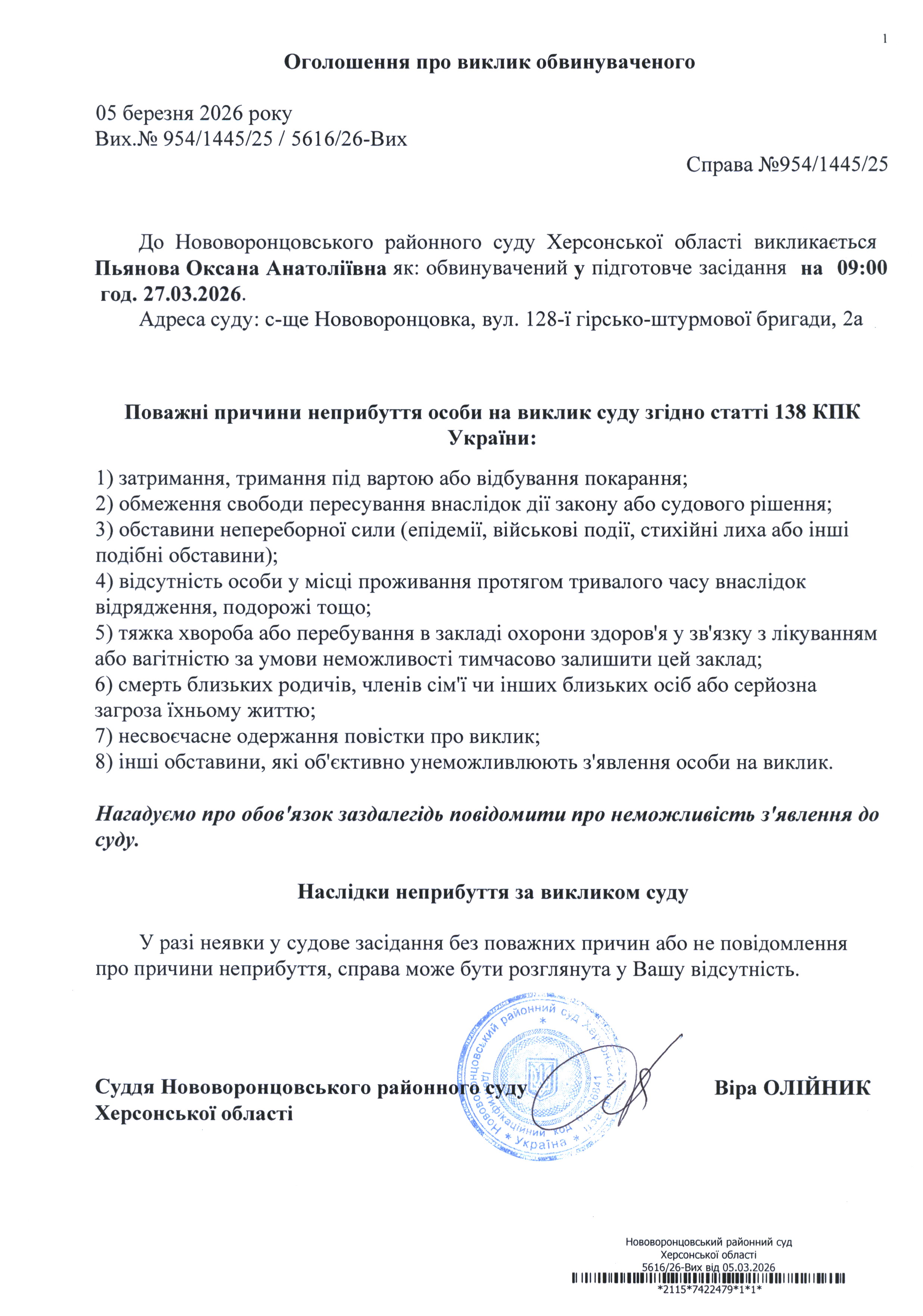 До суду викликається Пьянова Оксана Анатоліївна на 9 год. 00 хв. 27 березня 2026 року