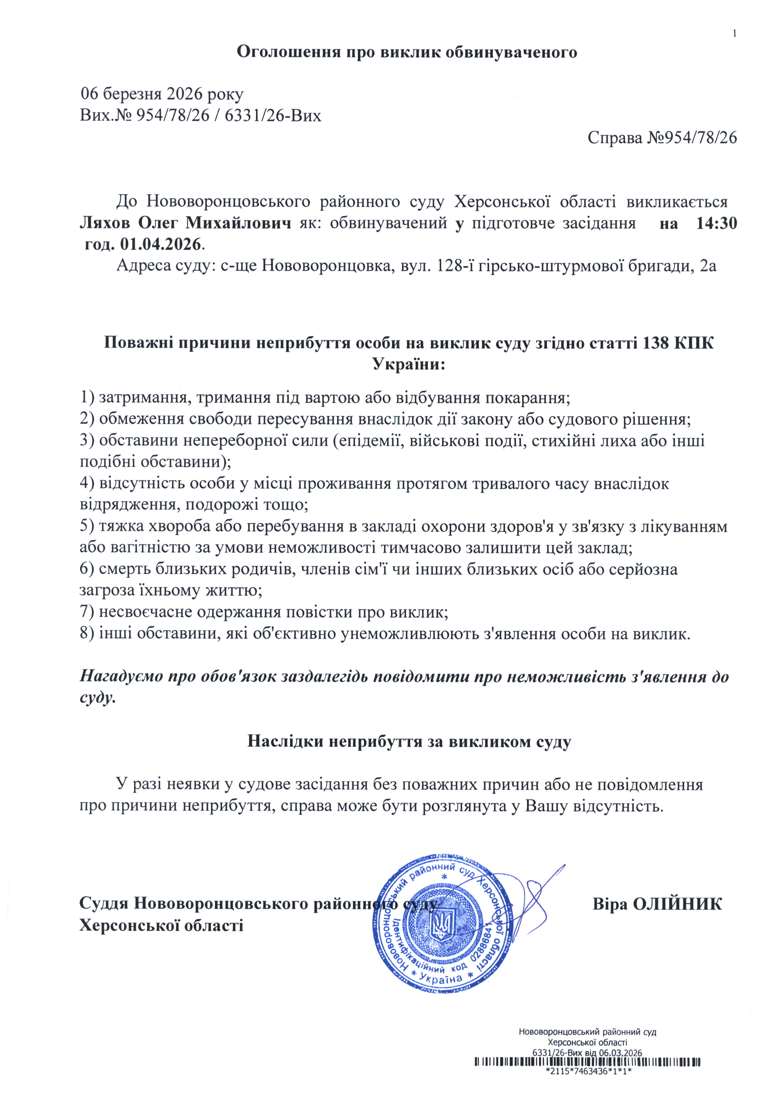 До суду викликається Ляхов Олег Михайлович на 14 год. 30 хв. 1 квітня 2026 року