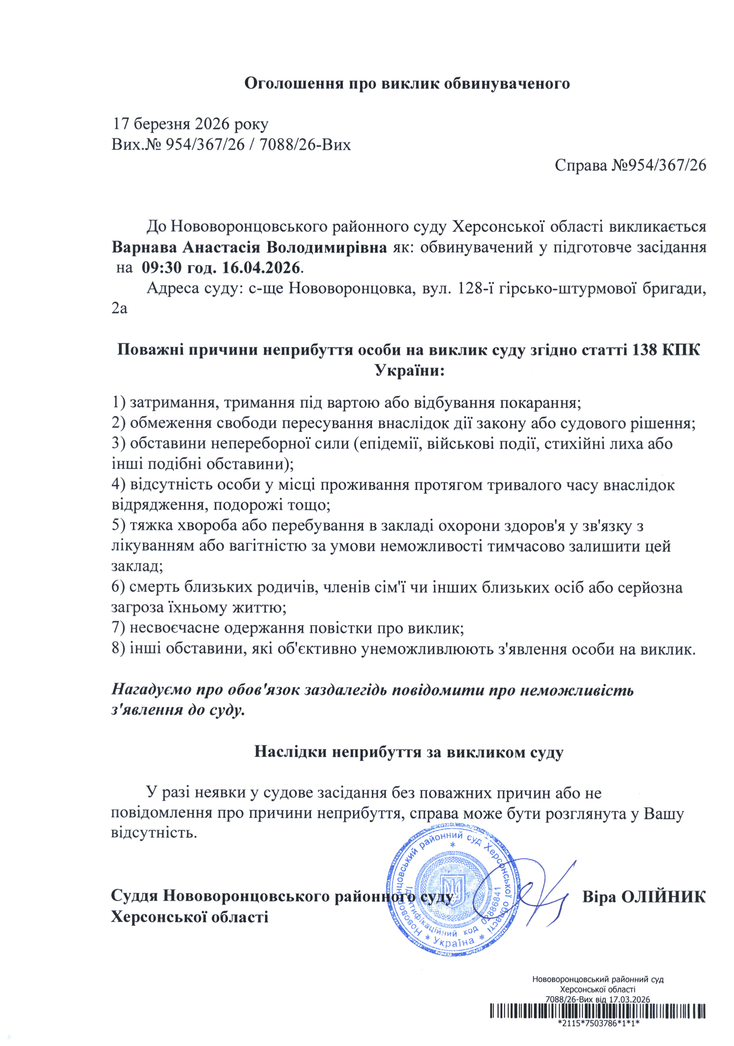 До суду викликається Варнава Анастасія Володимирівна на 9 год. 30 хв. 16 квітня 2026 року