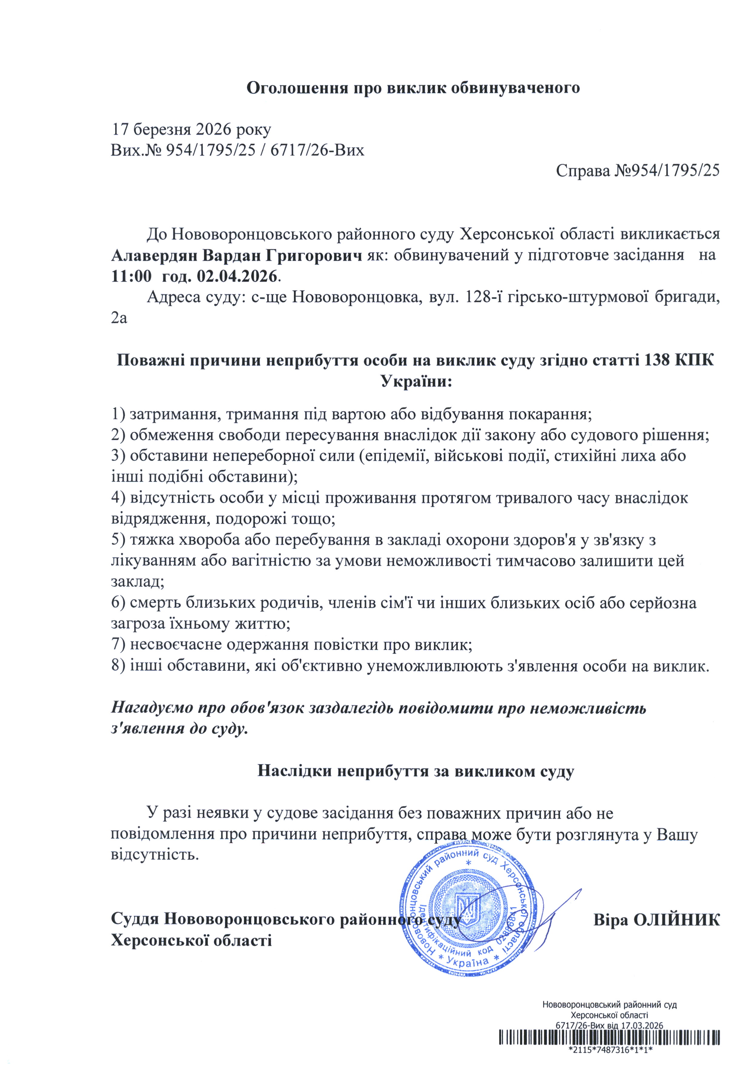 До суду викликається Алавердян Вардан Григорович на 11 год. 00 хв. 2 квітня 2026 року
