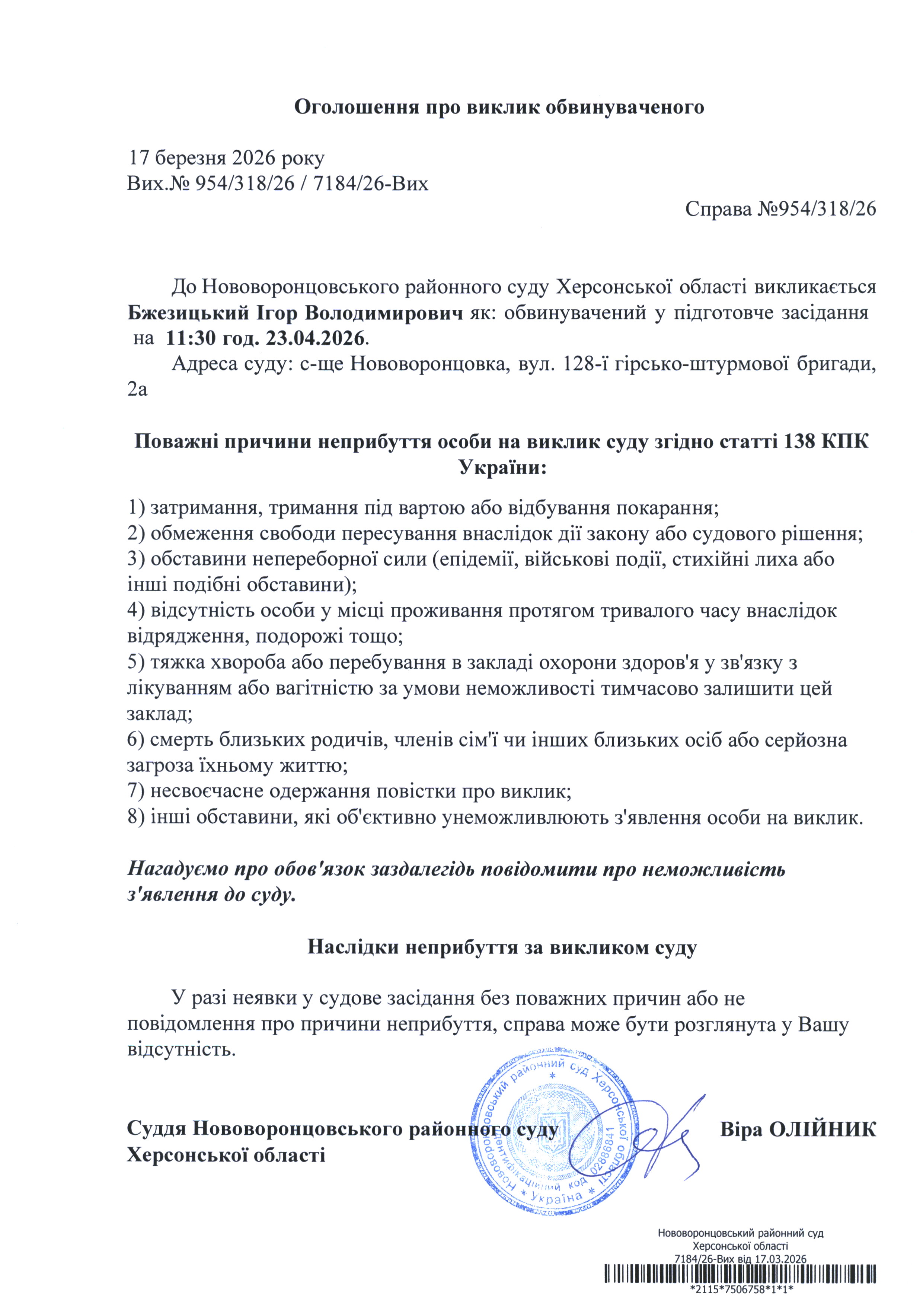 До суду викликається Бжезицький Ігор Володимирович на 11 год. 30 хв. 23 квітня 2026 року