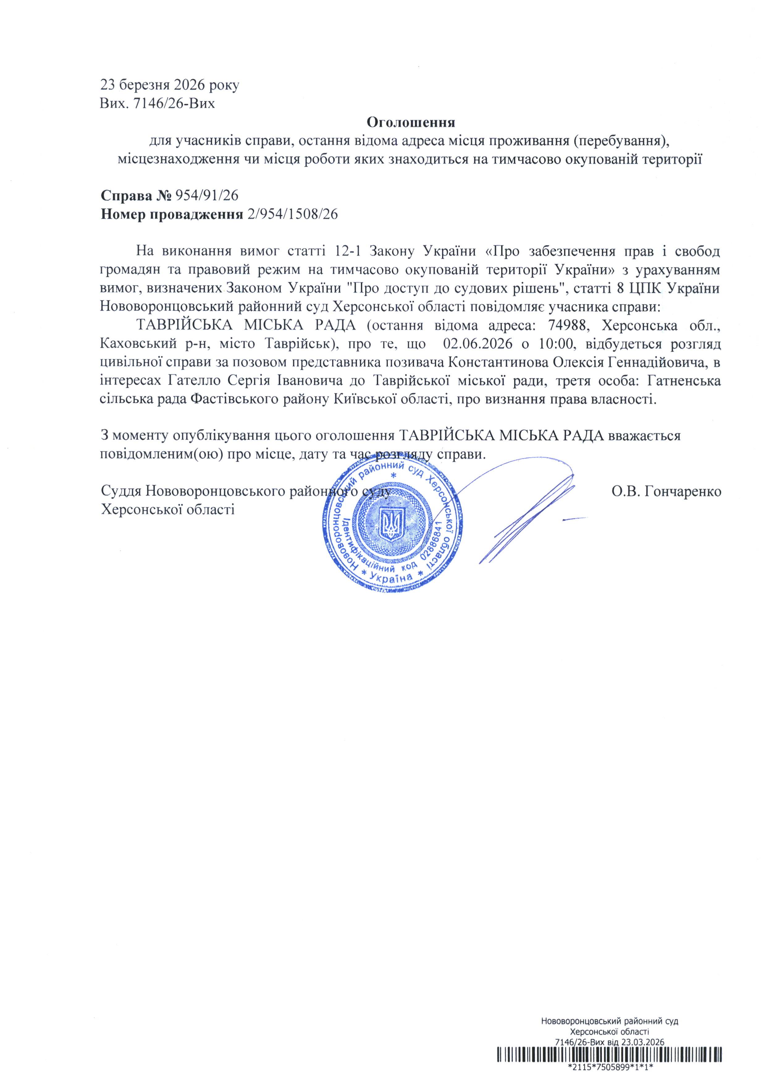 До суду викликається Таврійська міська рада на 10 год. 00 хв. 2 червня 2026 року