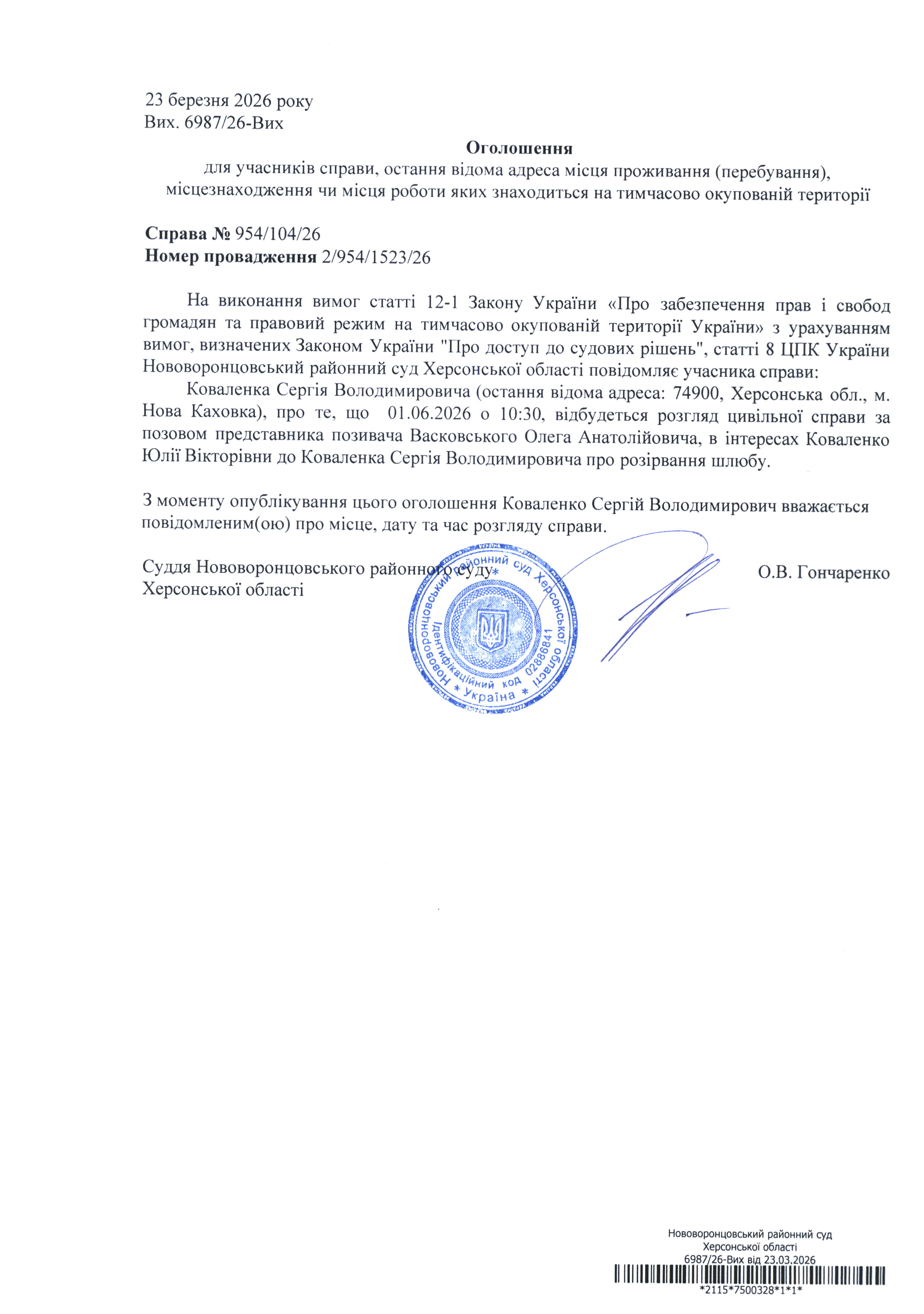 До суду викликається Коваленко Сергій Володимирович на 10 год. 30 хв. 1 червня 2026 року