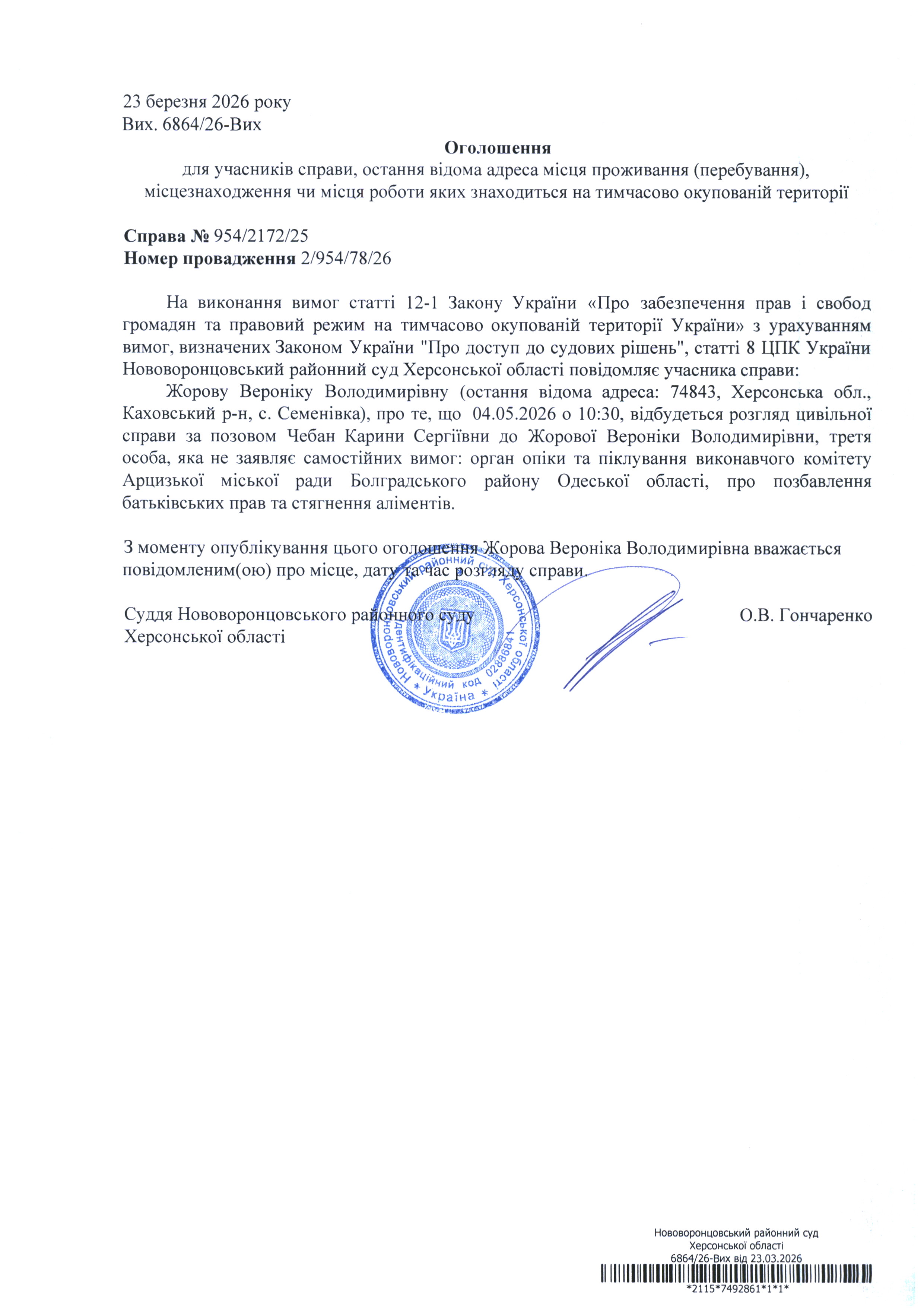 До суду викликається Жорова Вероніка Володимирівна на 10 год. 30 хв. 4 травня 2026 року