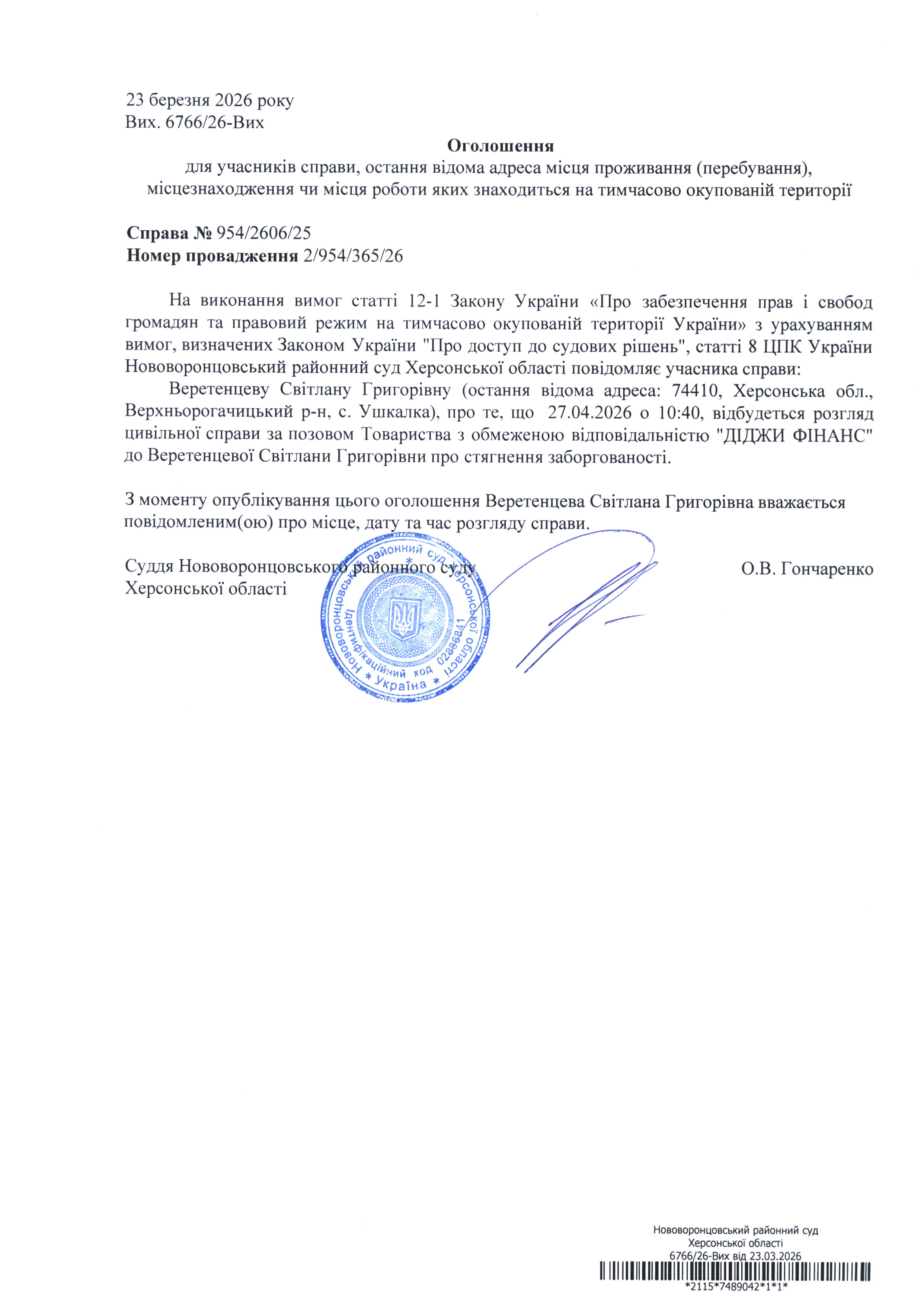 До суду викликається Веретенцева Світлана Григорівна на 10 год. 40 хв. 27 квітня 2026 року
