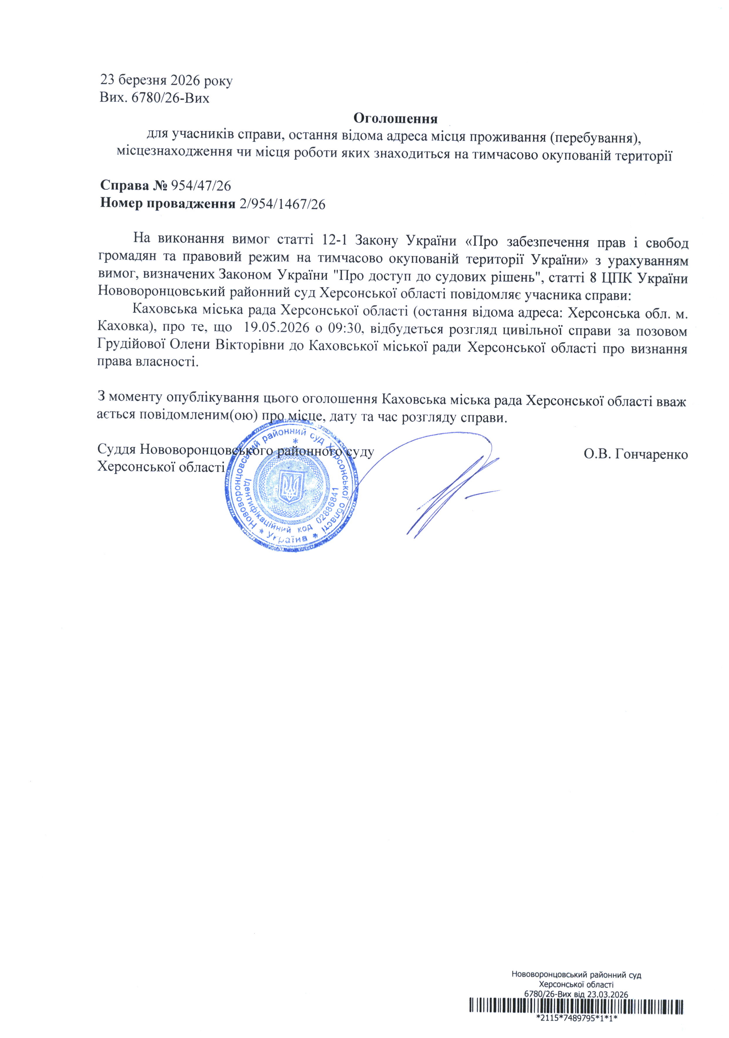 До суду викликається Каховська міська рада Херсонської області на 9 год. 30 хв. 19 травня 2026 року