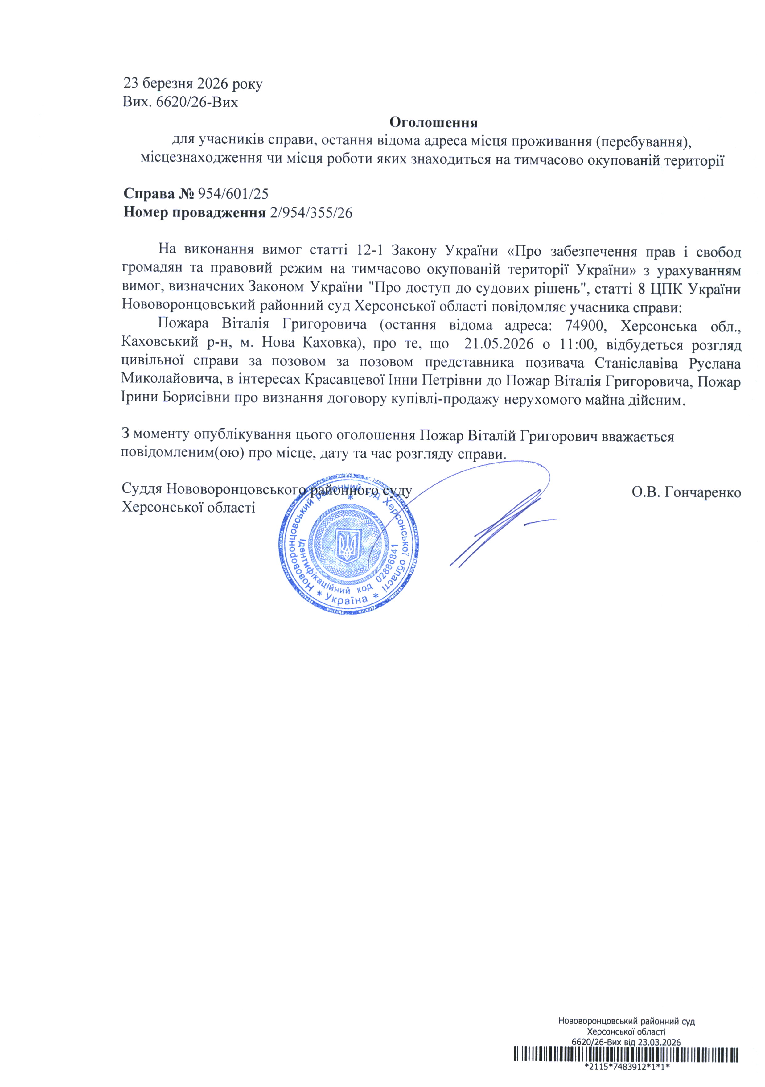 До суду викликається Пожар Віталій Григорович на 11 год. 00 хв. 21 травня 2026 року