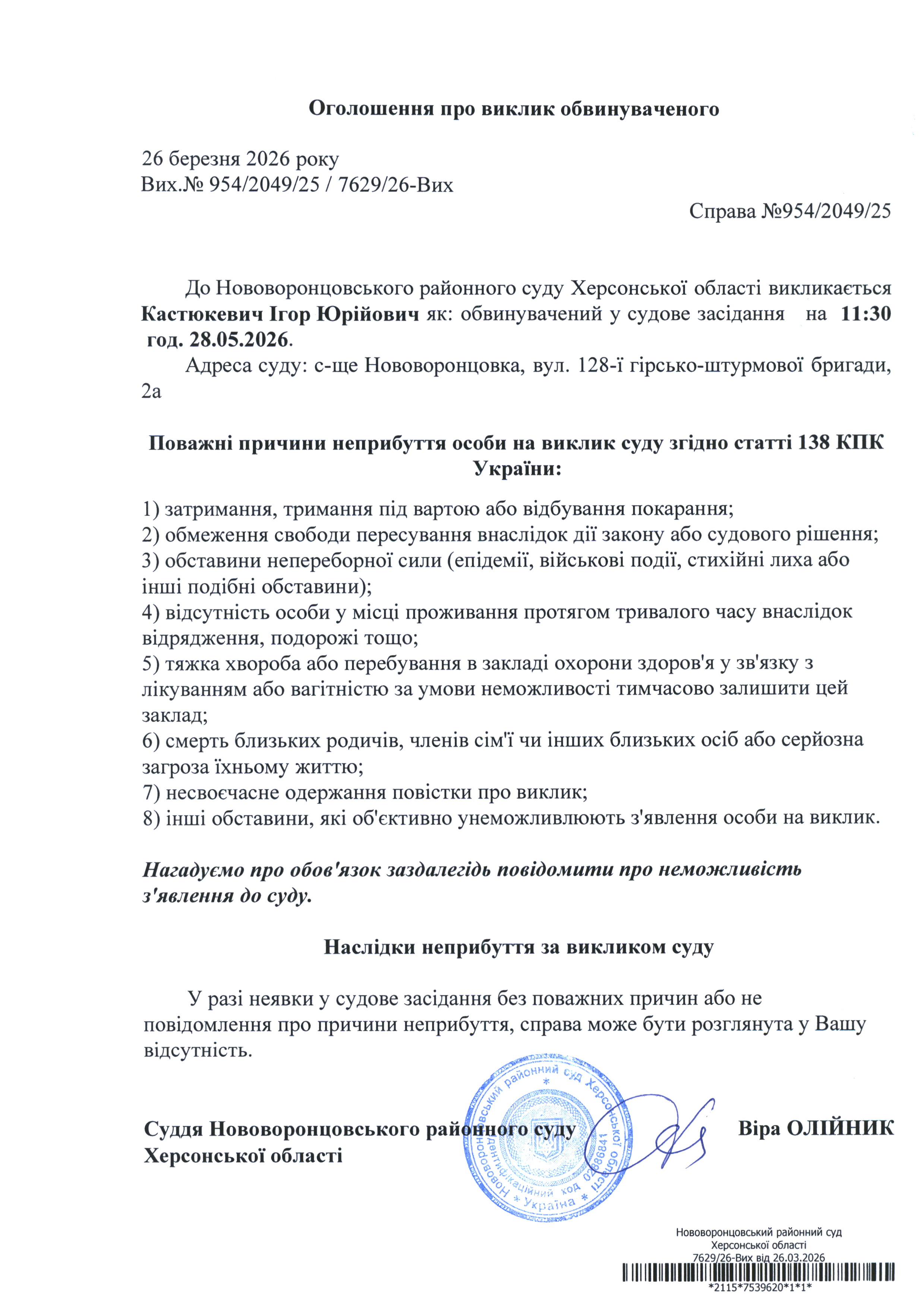 До суду викликається Кастюкевич Ігор Юрійович на 11 год. 30 хв. 28 травня 2026 року