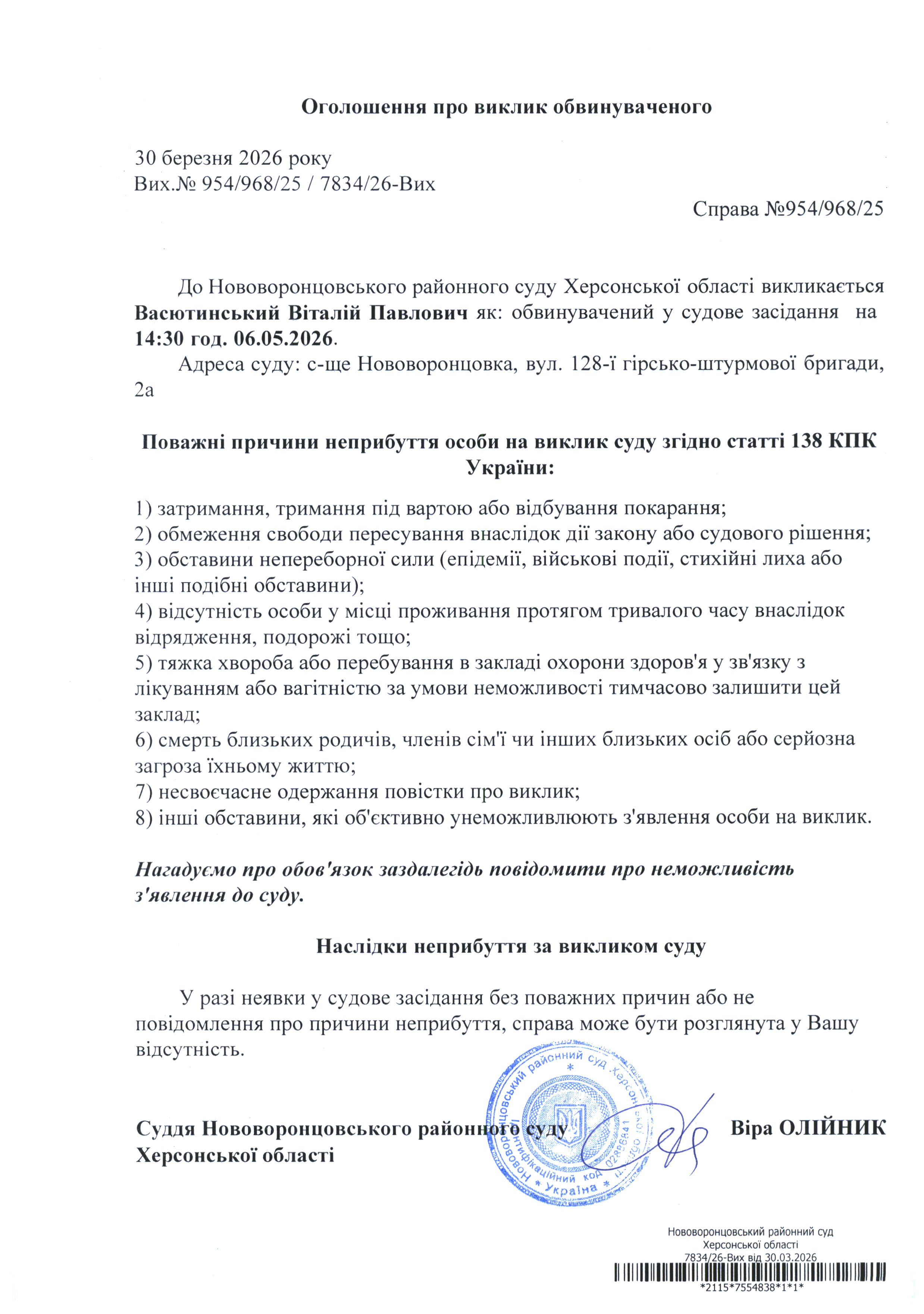 До суду викликається Васютинський Віталій Павлович на 14 год. 30 хв. 6 травня 2026 року