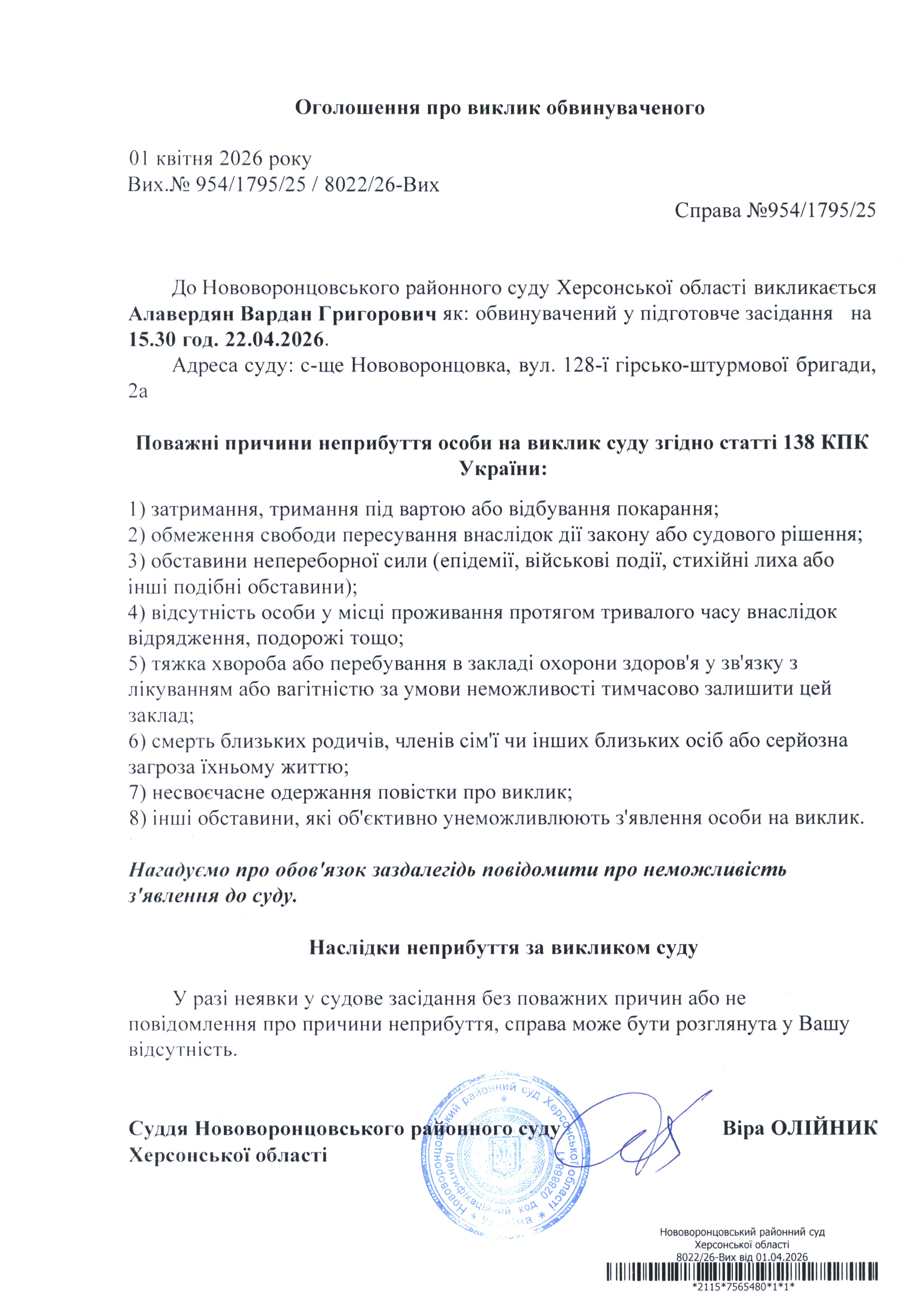 До суду викликається Алавердян Вардан Григорович на 15 год. 30 хв. 22 квітня 2026 року
