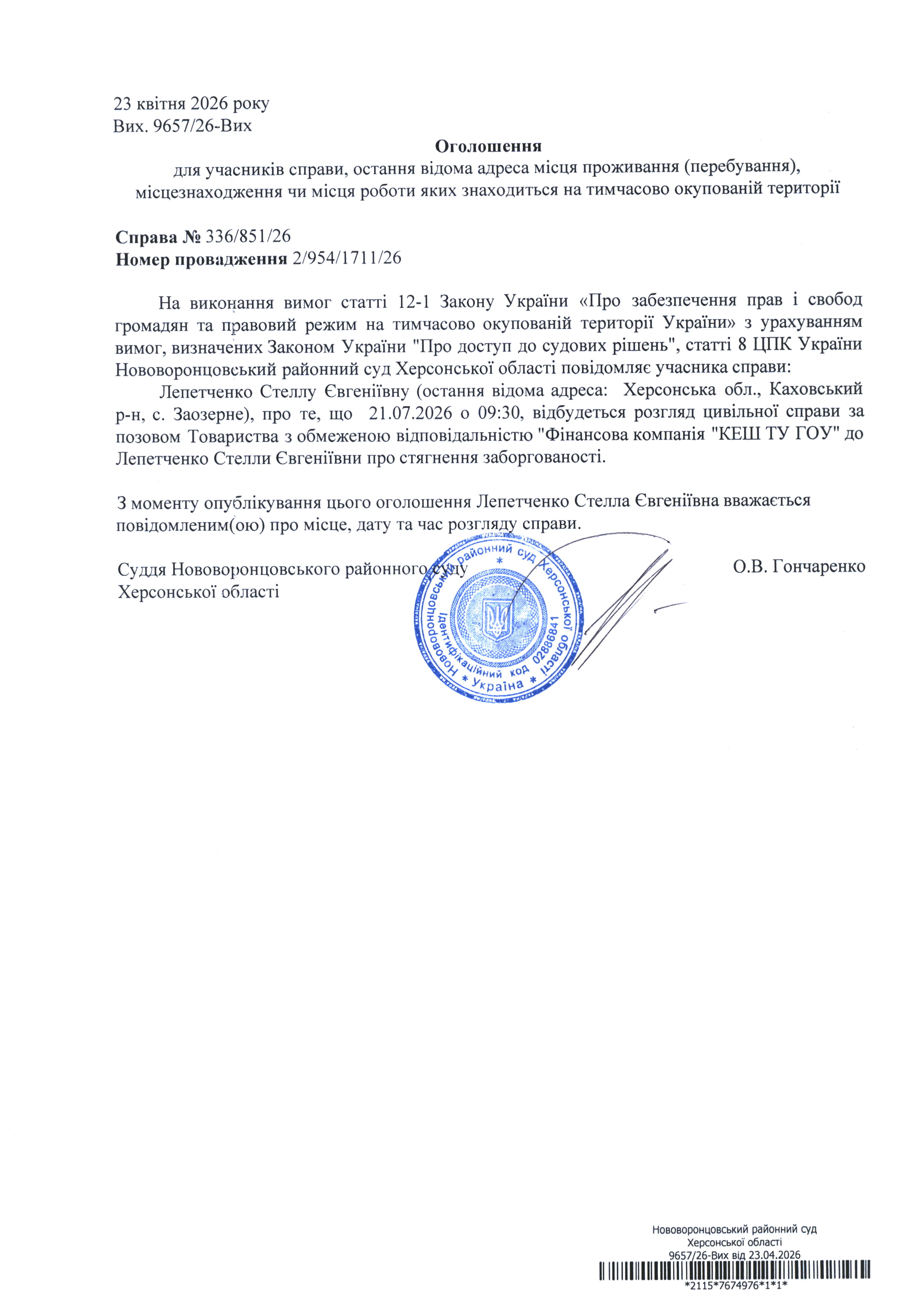 До суду викликається Лепетченко Стелла Євгеніївна на 9 год. 30 хв. 21 липня 2026 року