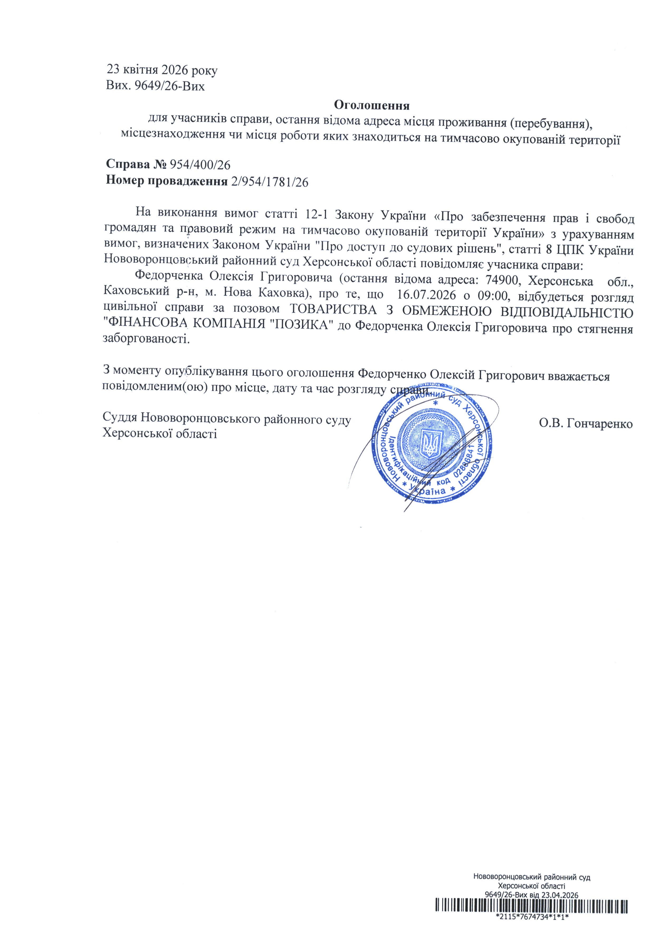До суду викликається Федорченко Олексій Григорович на 9 год. 00 хв. 16 липня 2026 року