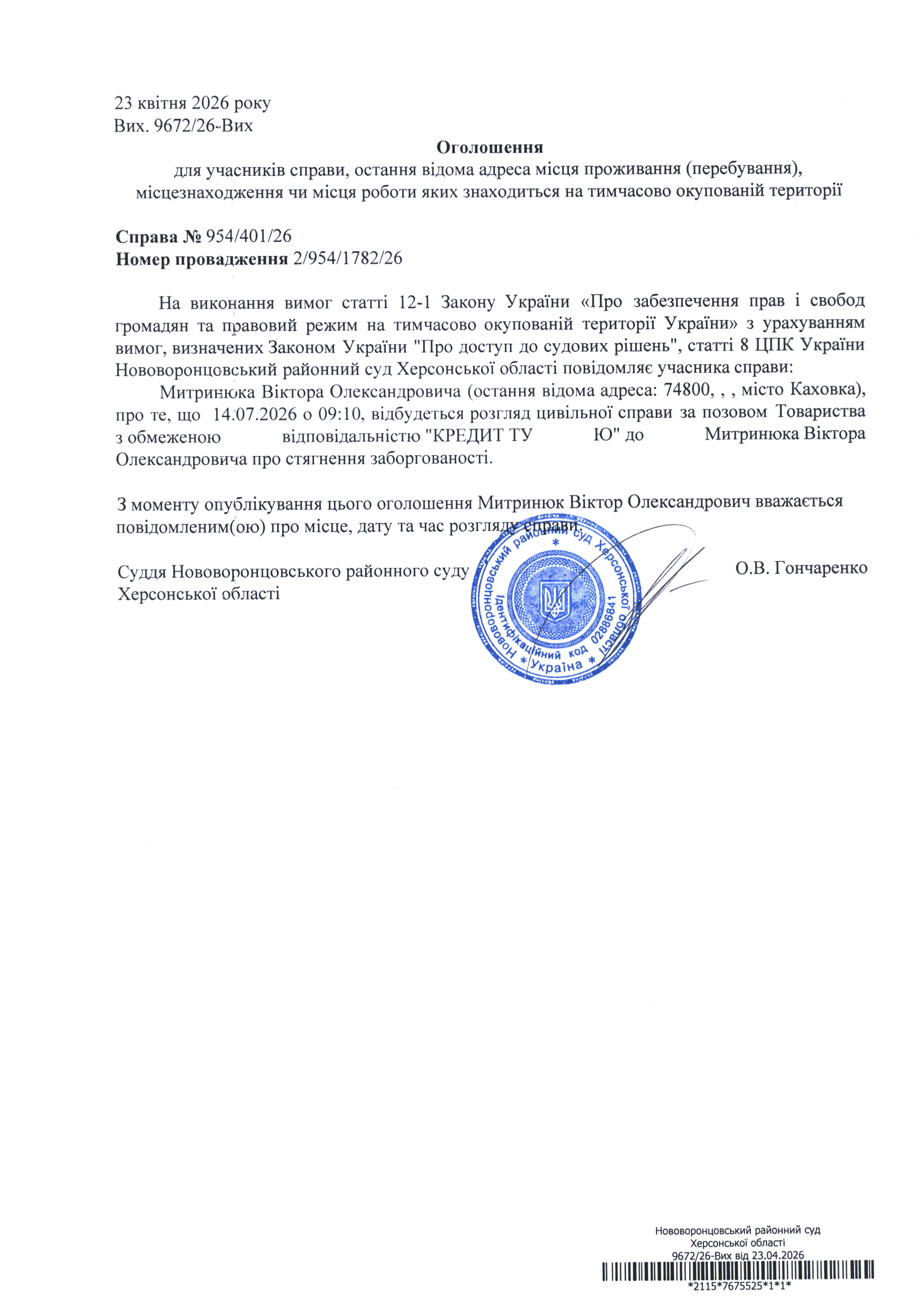 До суду викликається Митринюк Віктор Олександрович на 9 год. 10 хв. 14 липня 2026 року