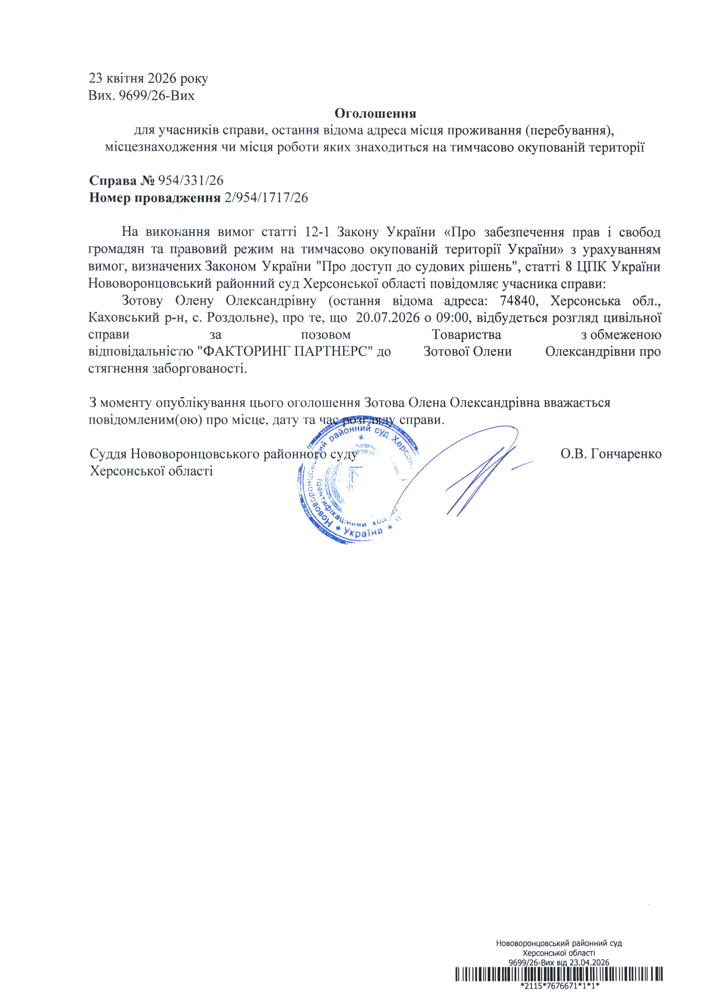 До суду викликається Зотова Олена Олександрівна на 9 год. 00 хв. 20 липня 2026 року