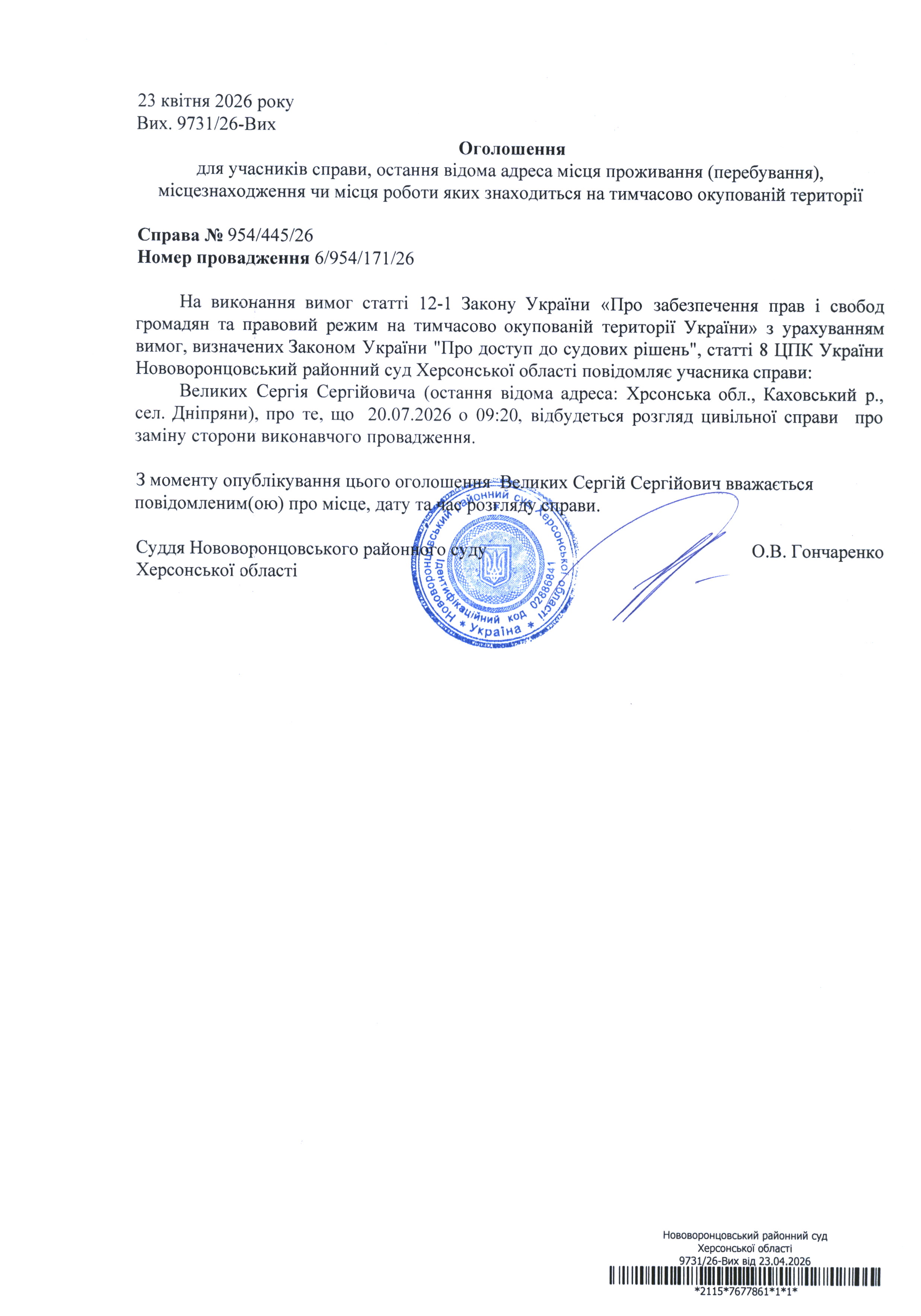 До суду викликається Великих Сергій Сергійович на 9 год. 20 хв. 20 липня 2026 року